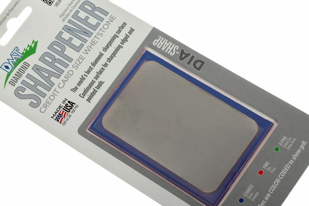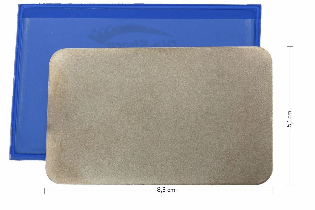 Esta piedra de afilar compacta con superficie de afilado de diamante puede llevarse incluso en la cartera gracias a su tamaño de tarjeta de crédito. Esto hace que la piedra sea ideal para todos los que quieran utilizar un cuchillo bien afilado en todo momento. Estas piedras no tienen el conocido patrón de agujeros del DMT. Esto tiene la ventaja de que, por ejemplo, se pueden afilar cinceles pequeños u otros objetos pequeños sin que se atasquen en los agujeros.